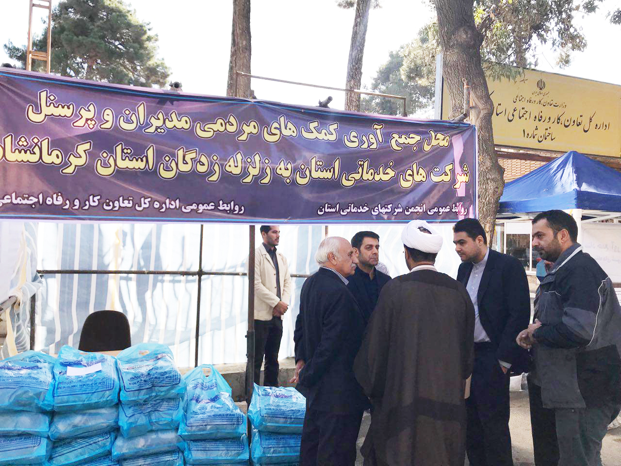 پایگاه جمع آوری کمک های مردمی انجمن صنفی شرکت های خدماتی استان کرمانشاه. محل : خیابان اشرفی اصفهانی جنب اداره کل تعاون کار و رفاه اجتماعی استان