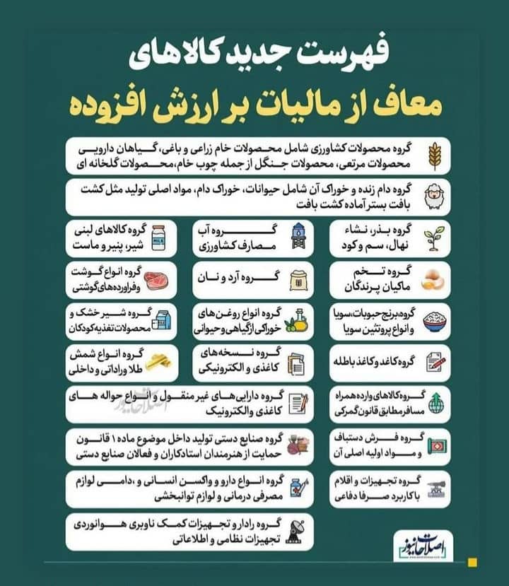 فهرست جدید کالاهای معاف از مالیات بر ارزش افزوده
