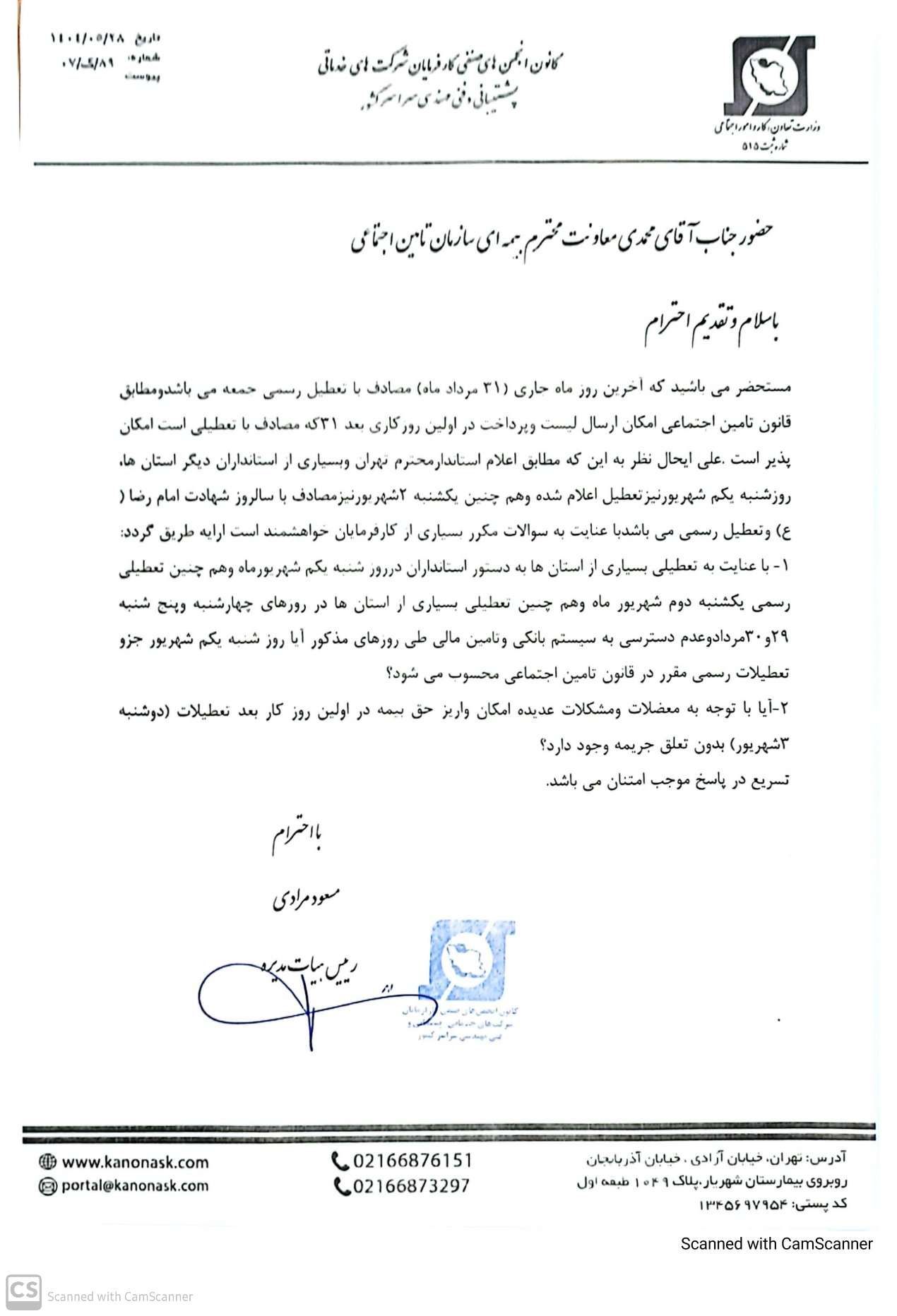 ارسال نامه ریاست محترم کانون خدماتی سراسر کشور جناب آقای مسعود مرادی به معاونت محترم بیمه ای سازمان تامین اجتماعی