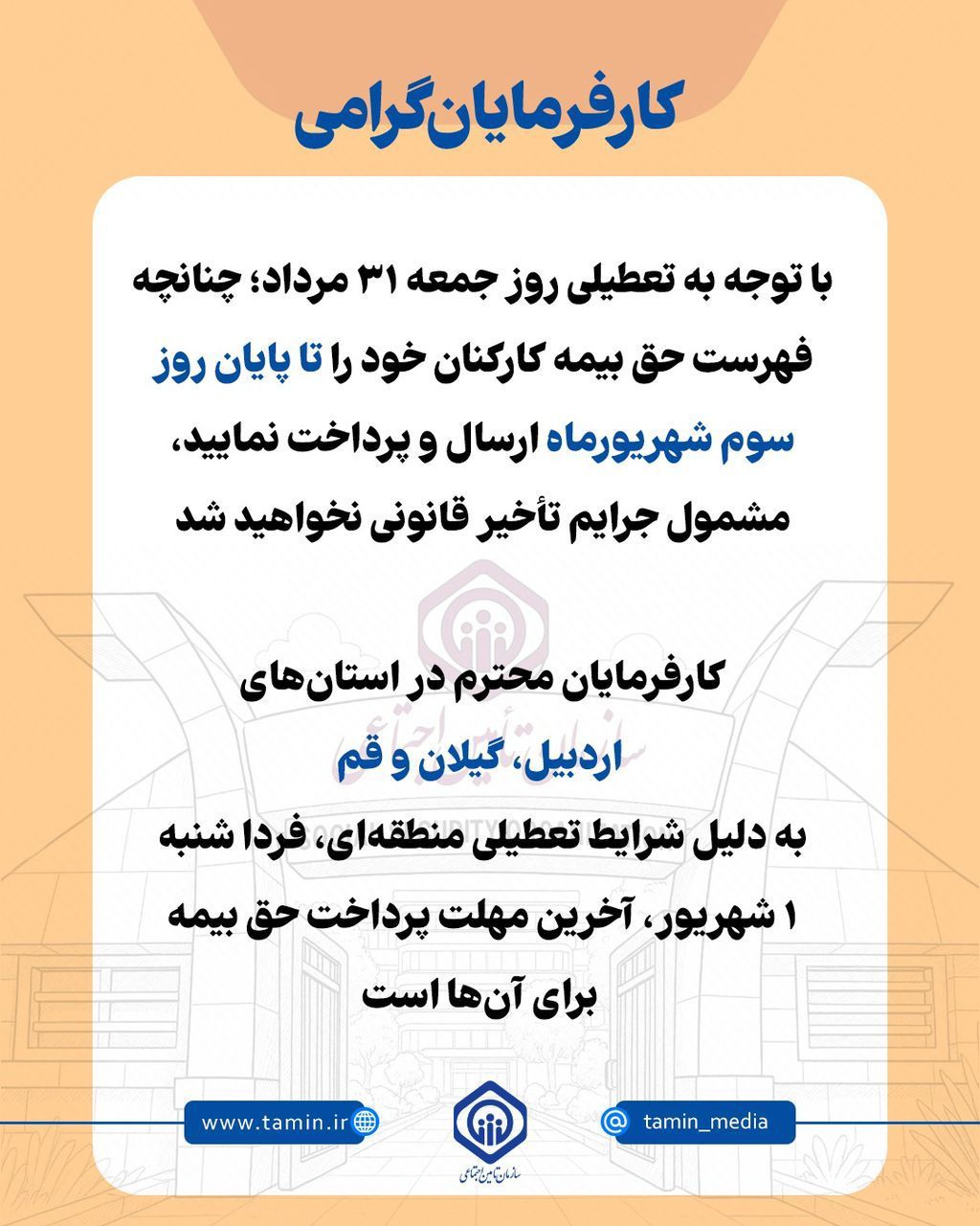 امروز ۳شهریور آخرین مهلت ارسال لیست وپرداخت حق بیمه تیرماه می باشد