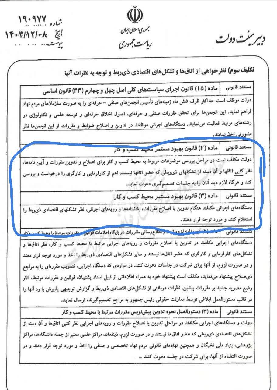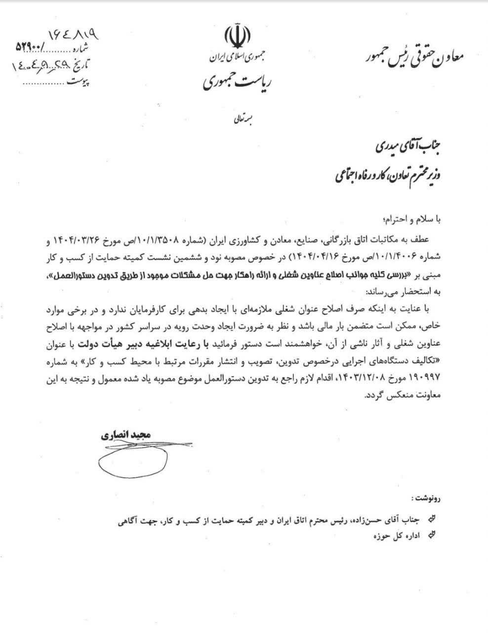 معاون حقوقی رئیس جمهور خطاب به وزیر کار : صرف اصلاح عنوان شغلی ملازمه ای با ایجاد بدهی برای کارفرمایان ندارد...
