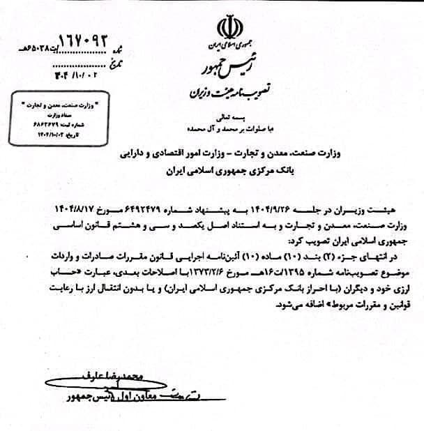 در مصوبه هیات وزیران و با امضای معاون اول رئیسجمهور، عبارت «حساب ارزی خود و دیگران و یا بدون انتقال ارز با رعایت قوانین و مقررات مربوط» به انتهای جزء ۲ بند ۱۰ ماده ۱۰ آییننامه اجرایی قانون مقررات صادرات و واردات، اضافه شد.