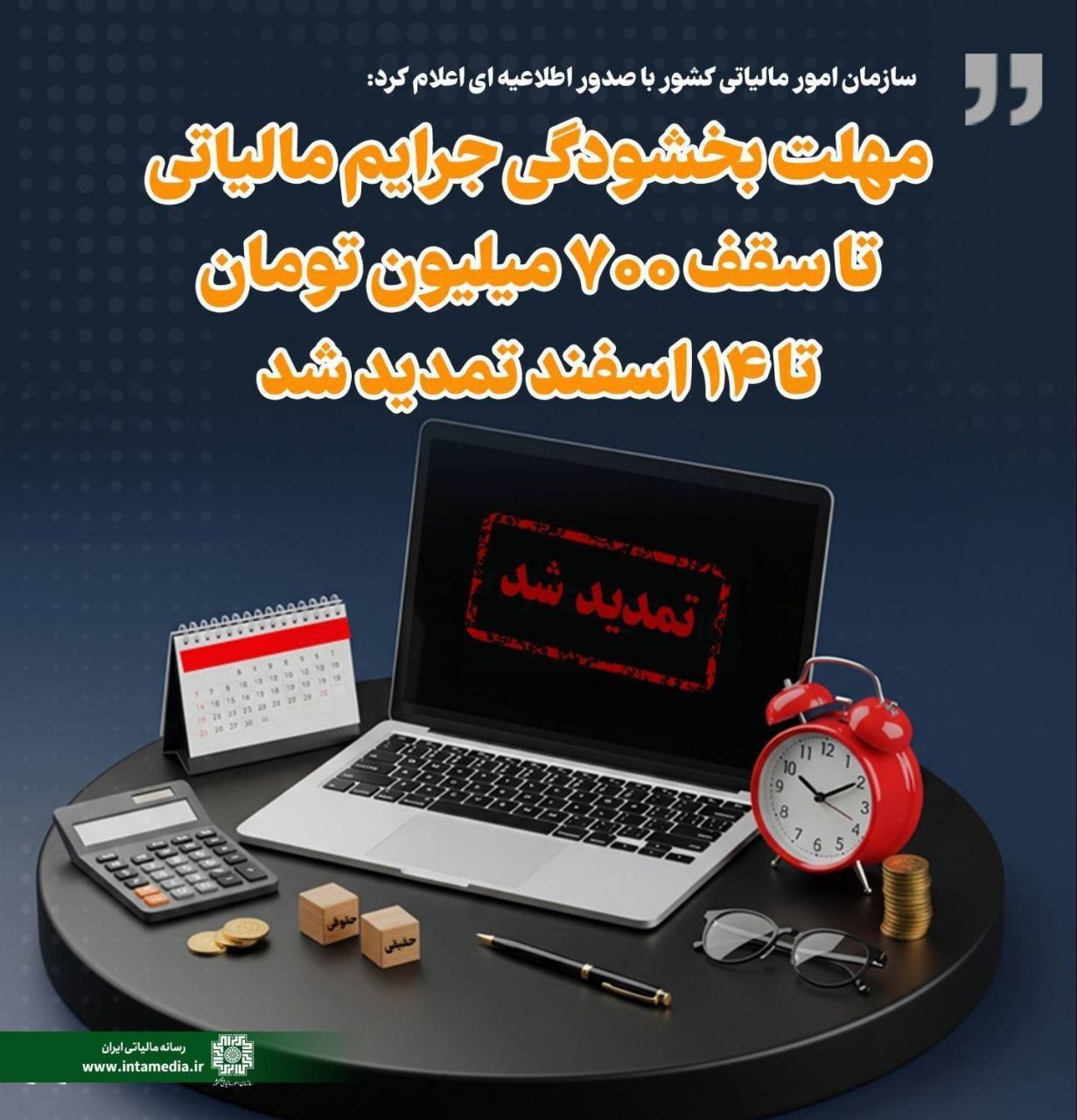 مهلت بخشودگی جرایم مالیاتی تا سقف ۷۰۰ میلیون تومان تا ۱۴ اسفند تمدید شد